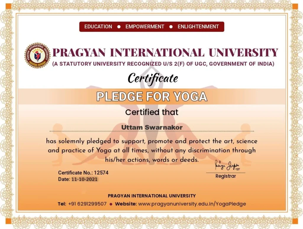 شارك وتعهد في برنامج تدريب اليوغا من جامعة براجيان الدولية في جهارخاند الهند في 2021.