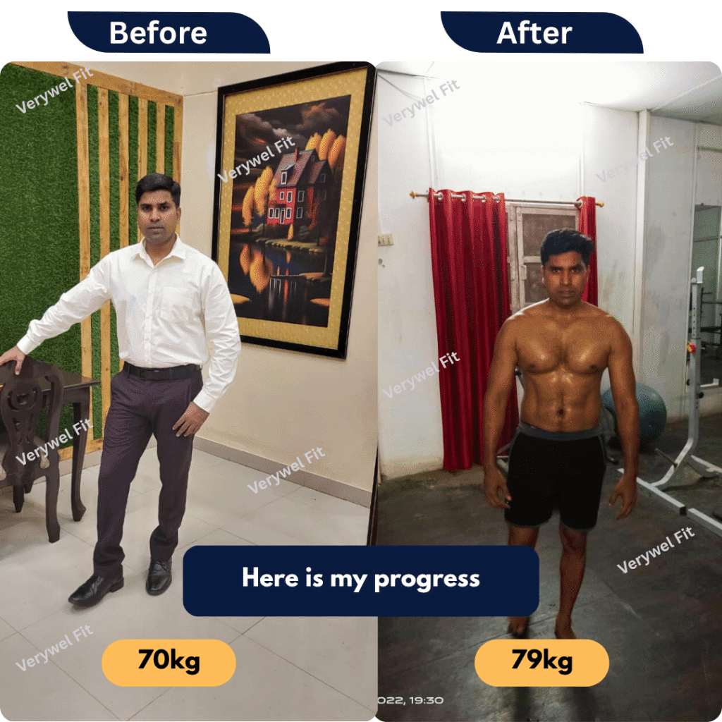 I went from 70kg to 79kg with the guidance of Verywel Fit. This journey taught me the power of consistent training, proper nutrition, and dedication. The results speak for themselves — stronger, healthier, and more confident than ever!