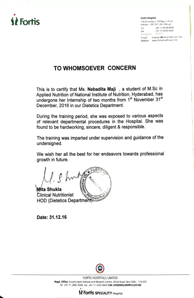 Teve uma experiência hospitalar com experiência na área de nutricionista. Feito o estágio cerca de seis meses a partir Hospital Fortis em Calcutá (Bengala Ocidental) em 2016. Teve uma boa exposição em vários aspectos dos procedimentos departamentais relevantes no hospital.