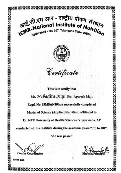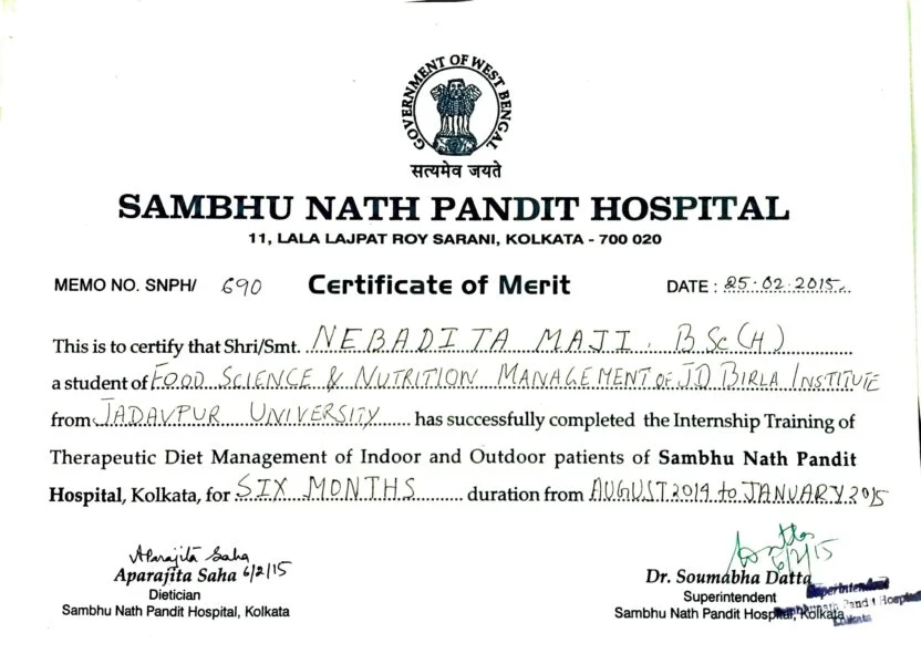 Teve uma experiência hospitalar com experiência na área de nutricionista. Feito o estágio cerca de seis meses a partir Hospital Pandit Sambhunath em Calcutá (Bengala Ocidental) em 2015. Teve uma boa exposição em vários aspectos no hospital.